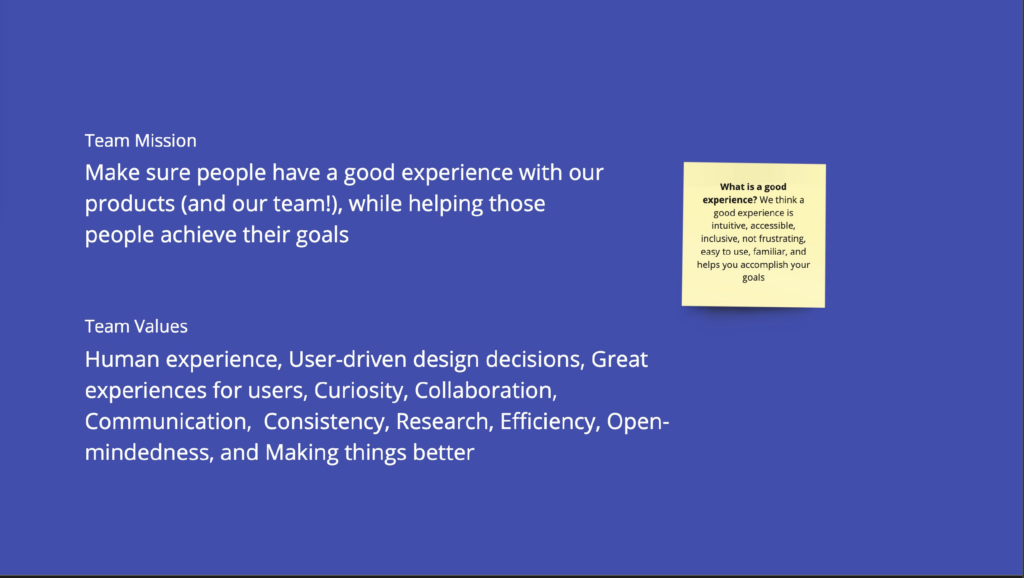 The previous year we had established our team mission and values, as well as identifying our UX maturity level as “Structured” per the Nielsen Normal Group’s UX maturity model.