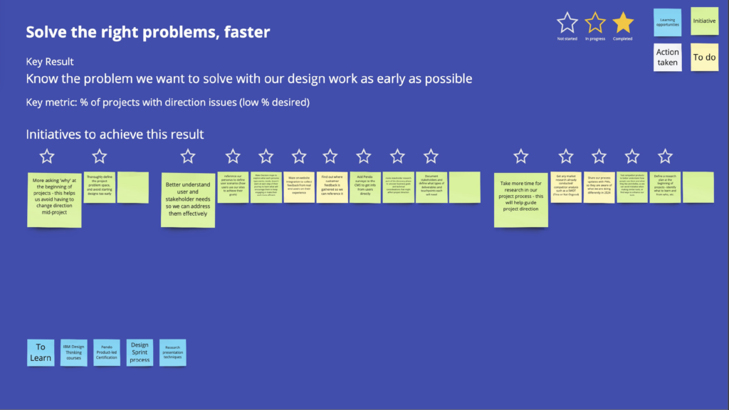 One of our Miro slides, tracking initiatives’ progress toward our OKRs