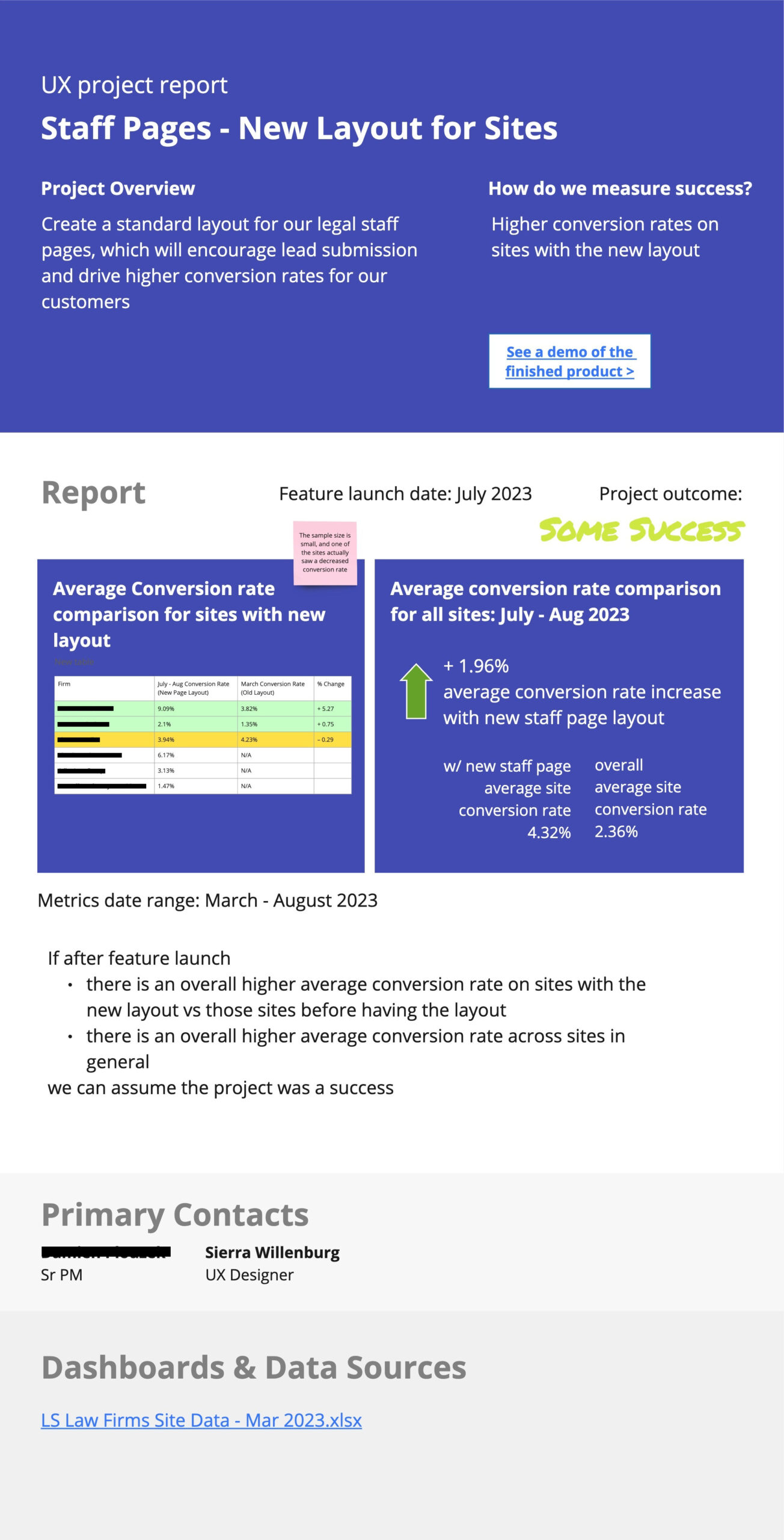 Responsible for optimizing page layouts to boost conversions on legal firm websites. Employed a standardized report created by the Product Design team to evaluate project success. The report, tailored for quick stakeholder communication, highlights key project metrics and the designer’s assessment of project performance.